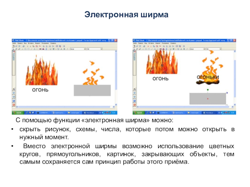 Вместо электронной ширмы возможно использование цветных кругов, прямоугольников, картинок, закрывающих объекты, тем самым сохраняется сам принцип работы этого приёма.