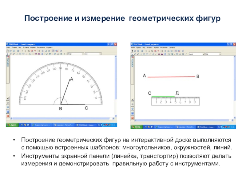 Инструменты экранной панели (линейка, транспортир) позволяют делать измерения и демонстрировать правильную работу с инструментами.