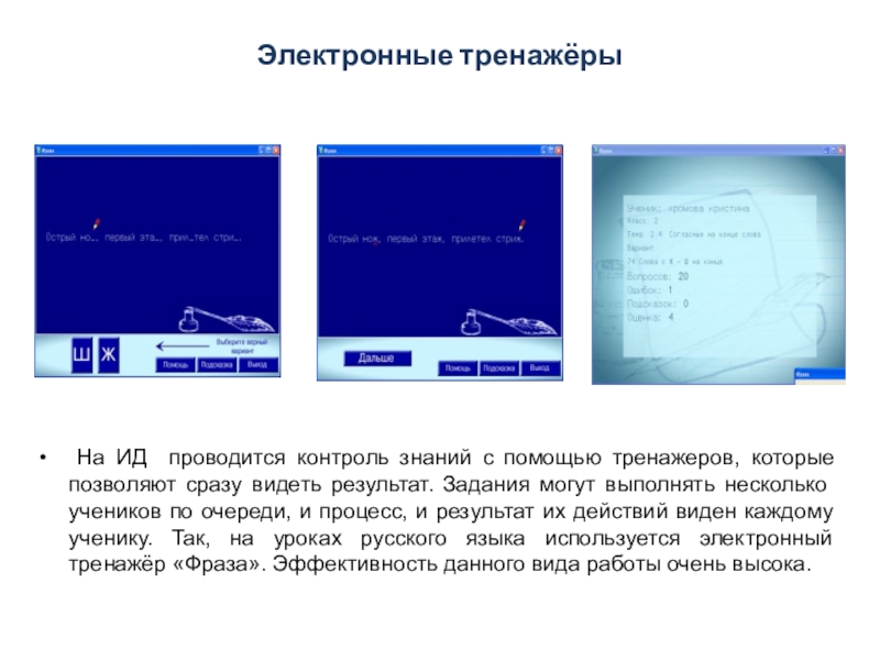 позволяют сразу видеть результат. Задания могут выполнять несколько учеников по очереди, и процесс, и результат их действий виден каждому ученику. Так, на уроках русского языка используется электронный тренажёр «Фраза». Эффективность данного вида работы очень высока.