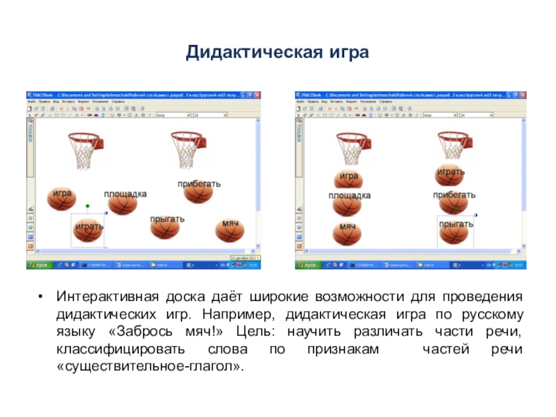 Например, дидактическая игра по русскому языку «Забрось мяч!» Цель: научить различать части речи, классифицировать слова по признакам частей речи «существительное-глагол».