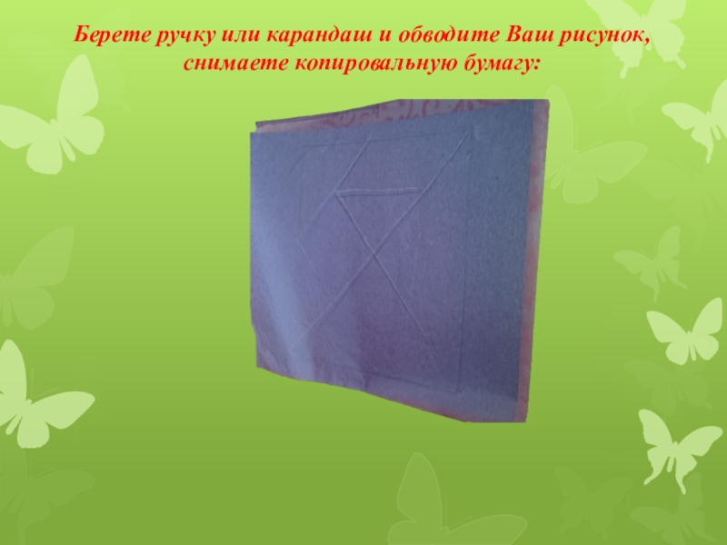 Слайд 11Берете ручку или карандаш и обводите Ваш рисунок, снимаете копировальную бумагу: