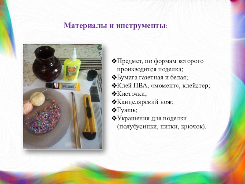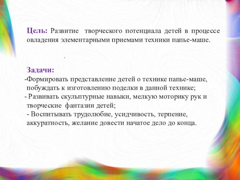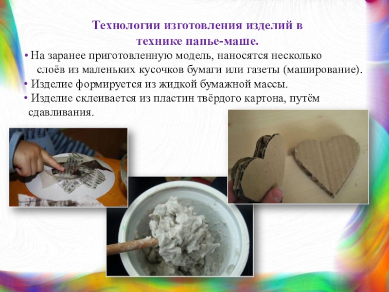 Развитие у детей способности к творческому поиску и преобразованию действительности способствует художественный ручной труд (в частности техника папье-маше), который воспринимается детьми с удовольствием, как увлекательная игра. Таким образом, изготовление поделок своими руками это часть художественно-эстетического развития, что открывает широкие перспективы созидания.