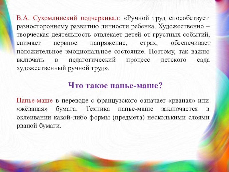 В.А. Сухомлинский подчеркивал: «Ручной труд способствует разностороннему развитию личности ребенка. Художественно – творческая деятельность отвлекает детей от грустных событий, снимает нервное напряжение, страх, обеспечивает положительное эмоциональное состояние. Поэтому, так важно включать в педагогический процесс детского сада художественный ручной труд».