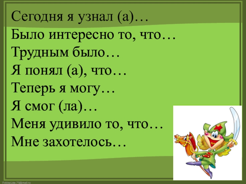 Сегодня я узнал (а)… Было интересно то, что… Трудным было… Я понял (а), что… Теперь я могу…