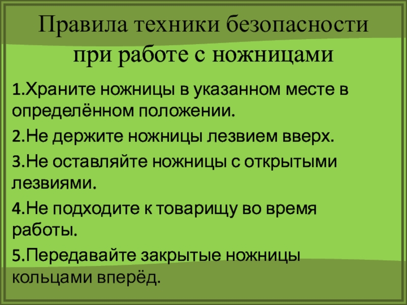Правила техники безопасности при работе с ножницами1.Храните ножницы в указанном месте в определённом положении. 2.Не держите ножницы