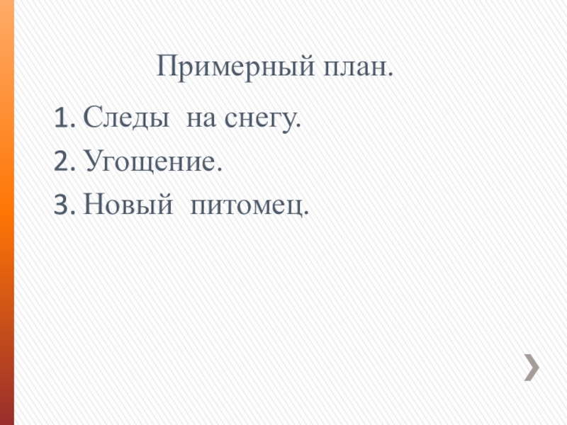 Примерный план.Следы на снегу.Угощение.Новый питомец.