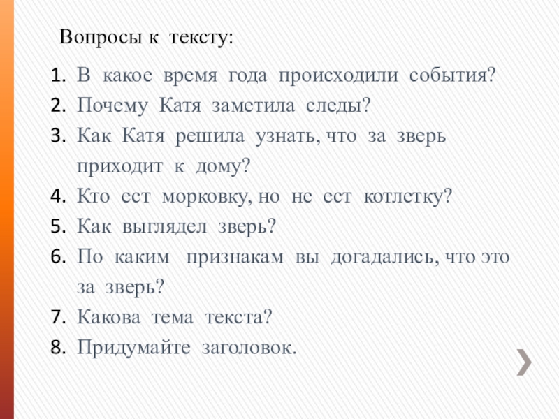 Вопросы к тексту:В какое время года происходили события?Почему Катя заметила следы?Как Катя решила узнать, что за