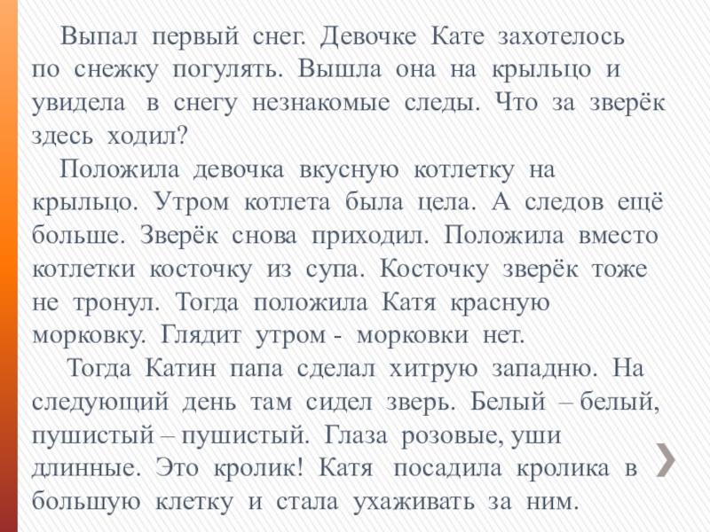 Выпал первый снег. Девочке Кате захотелось по снежку погулять. Вышла она на крыльцо и увидела в снегу незнакомые следы. Что за зверёк здесь ходил? Положила девочка вкусную котлетку на крыльцо.
