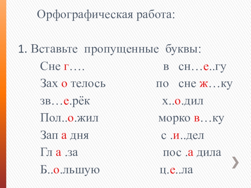 Орфографическая работа: Вставьте пропущенные буквы:Сне г….
