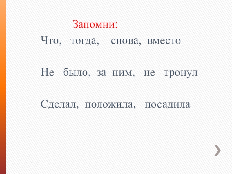 Запомни:Что,  тогда,  снова, вместо Не  было,