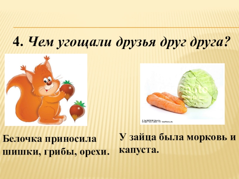 4. Чем угощали друзья друг друга?Белочка приносила шишки, грибы, орехи. У зайца была морковь и капуста.