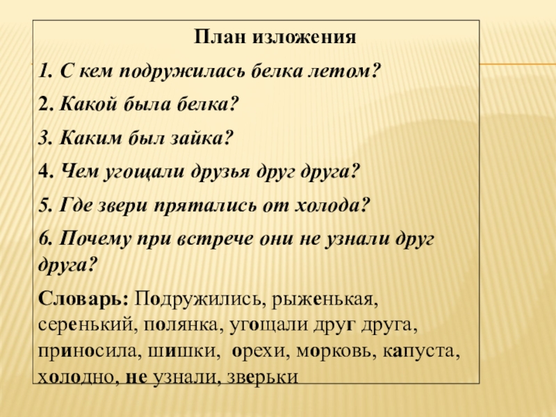 План изложения1. С кем подружилась белка летом?  2. Какой была белка?3.