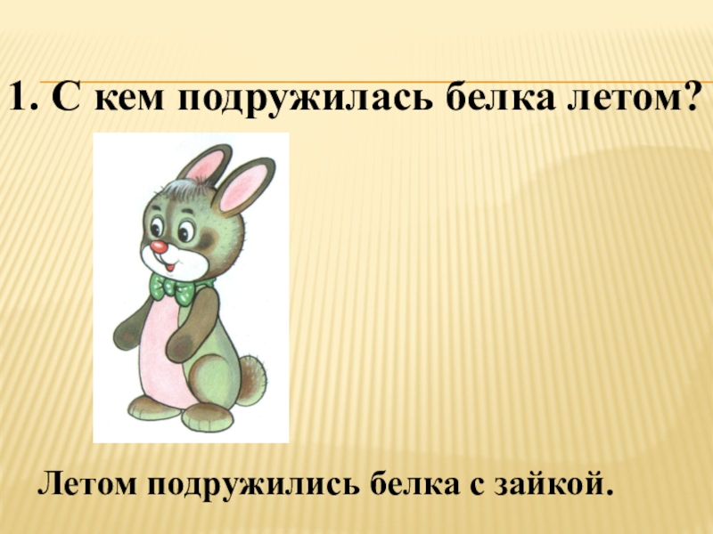 1. С кем подружилась белка летом?Летом подружились белка с зайкой.