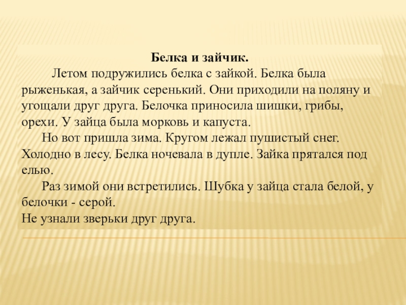 зайкой. Белка была рыженькая, а зайчик серенький. Они приходили на поляну и угощали друг друга. Белочка приносила шишки, грибы, орехи. У зайца была морковь и капуста.