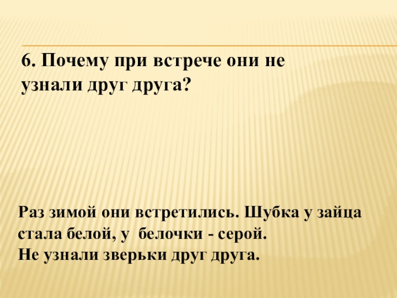 6. Почему при встрече они не узнали друг друга?Раз зимой они встретились. Шубка у зайца стала белой,