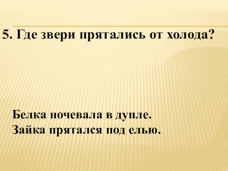 5. Где звери прятались от холода?Белка ночевала в дупле. Зайка прятался под елью.