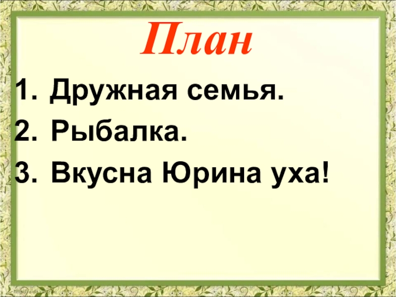 Беседа по содержаниюО чём этот текст?Куда поехала Юрина семья?Какую рыбку поймал Юра?Что сварила бабушка?Как нахваливала вся семья