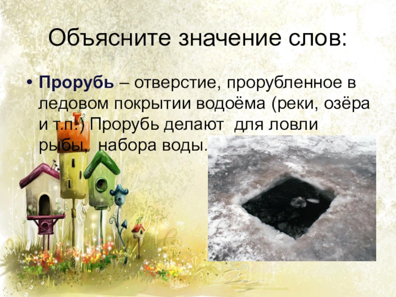 Объясните значение слов:Прорубь – отверстие, прорубленное в ледовом покрытии водоёма (реки, озёра и т.п.) Прорубь делают для