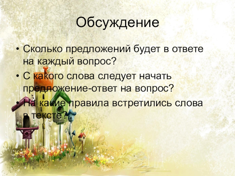 ОбсуждениеСколько предложений будет в ответе на каждый вопрос?С какого слова следует начать предложение-ответ на вопрос? На какие правила встретились слова в тексте?