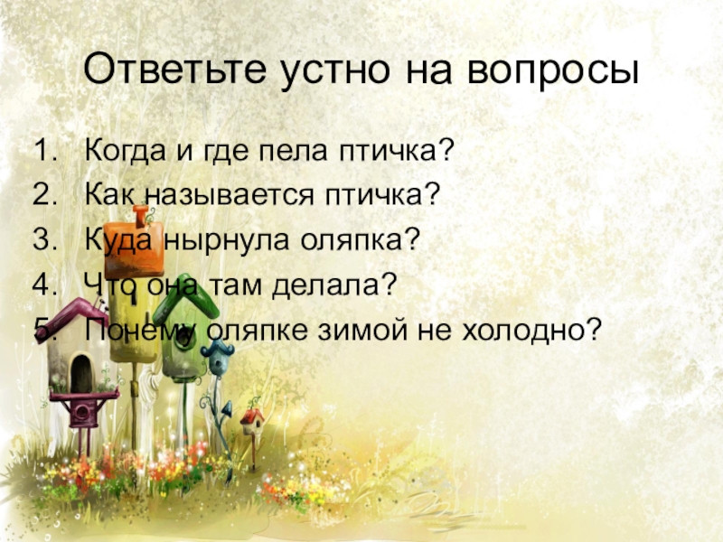 Ответьте устно на вопросыКогда и где пела птичка?Как называется птичка?Куда нырнула оляпка?Что она там делала?Почему оляпке зимой