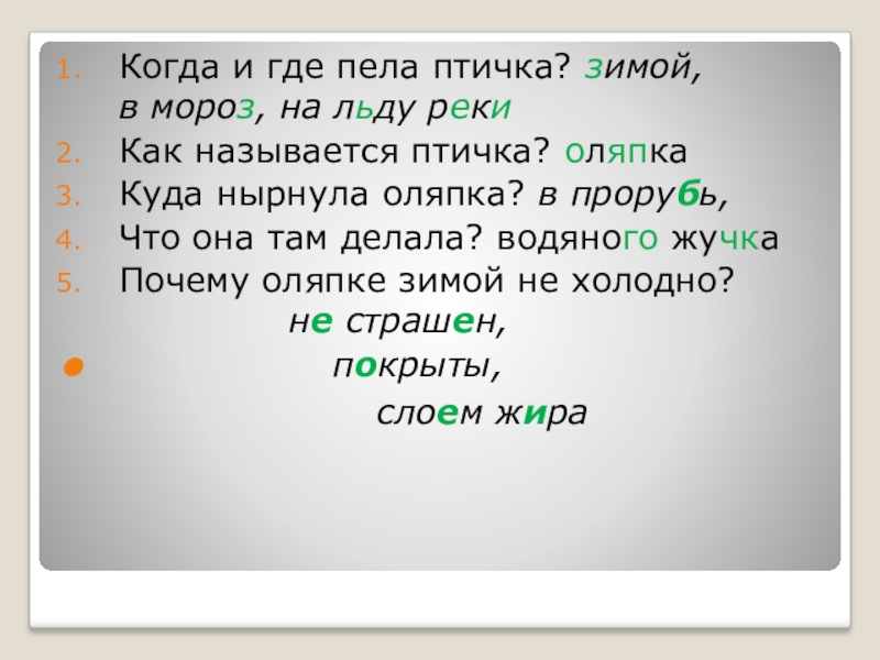 Когда и где пела птичка? зимой, в мороз, на льду рекиКак называется птичка? оляпкаКуда нырнула оляпка? в прорубь, Что она