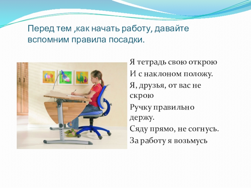 Слайд 4Перед тем ,как начать работу, давайте вспомним правила посадки.