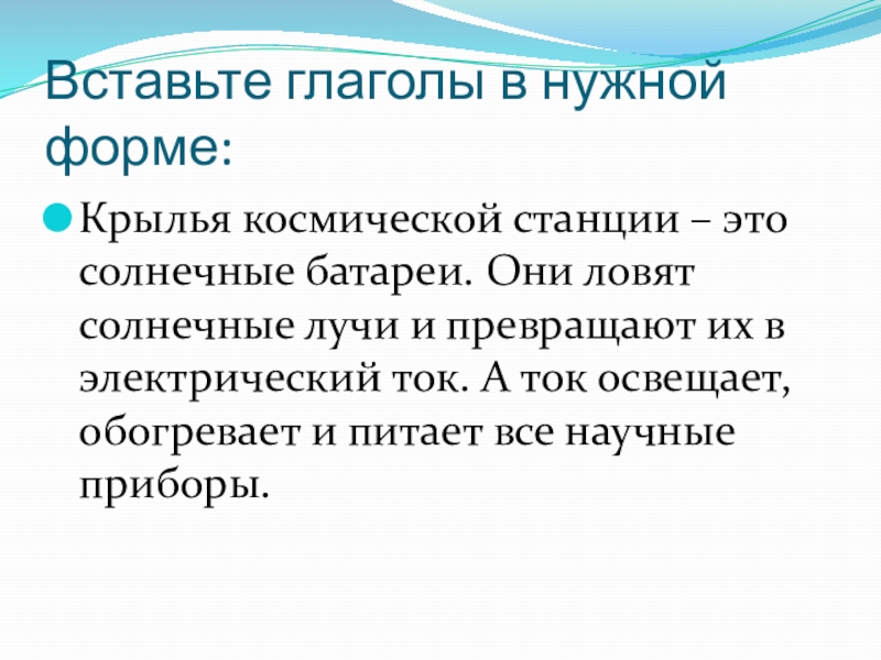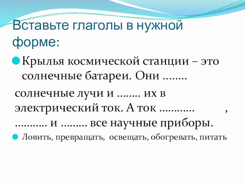 солнечные лучи и …….. их в электрический ток. А ток ………… , ……….. и ……… все научные приборы.