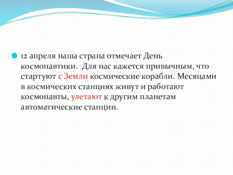Слайд 1212 апреля наша страна отмечает День космонавтики. Для нас кажется привычным,