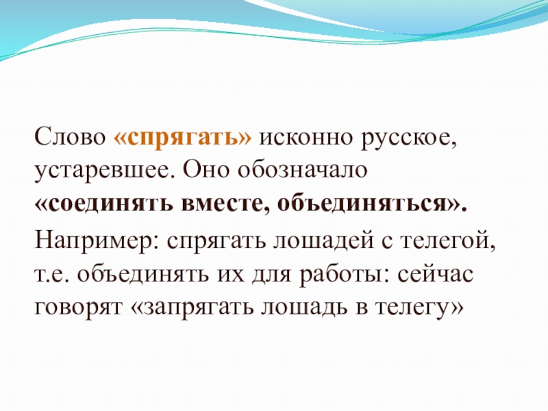 Слайд 16Слово «спрягать» исконно русское, устаревшее. Оно обозначало «соединять вместе, объединяться».