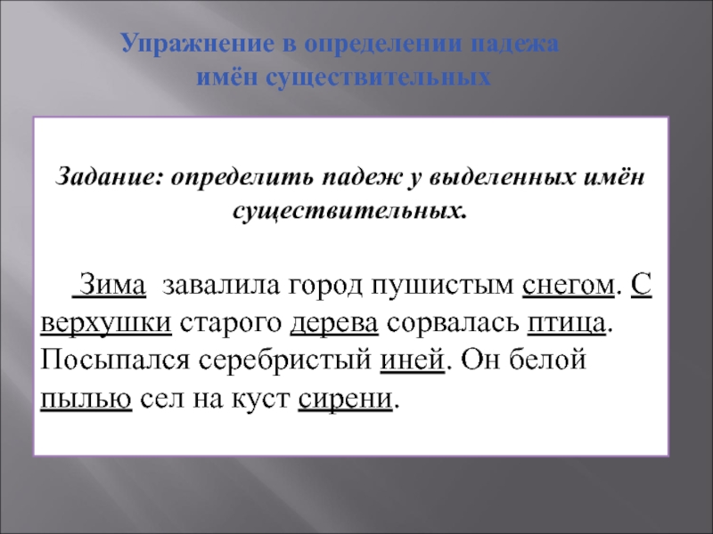 Зима завалила город пушистым снегом. С верхушки старого дерева сорвалась птица. Посыпался серебристый иней. Он белой пылью сел на куст сирени.