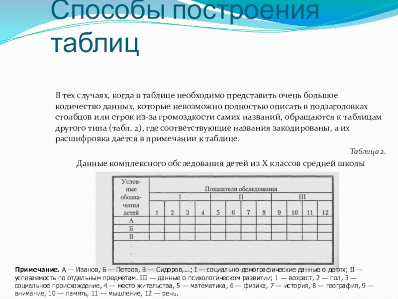 Примечание. А — Иванов, Б — Петров, В — Сидоров,...; I — социально-демографические данные о детях; II — успеваемость по отдельным предметам. III — данные о психологическом развитии; 1 — возраст, 2 — пол, 3 — социальное происхождение, 4 — место жительства, 5 — математика, 6 — физика, 7 — история, 8 — география, 9 — внимание, 10 — память, 11 — мышление, 12 — речь.