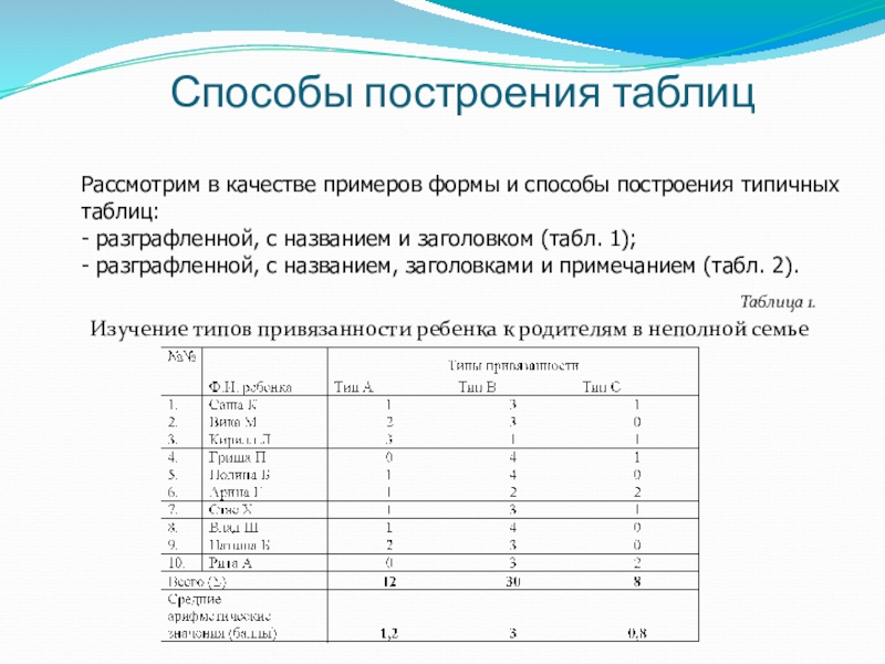 Рассмотрим в качестве примеров формы и способы построения типичных таблиц: