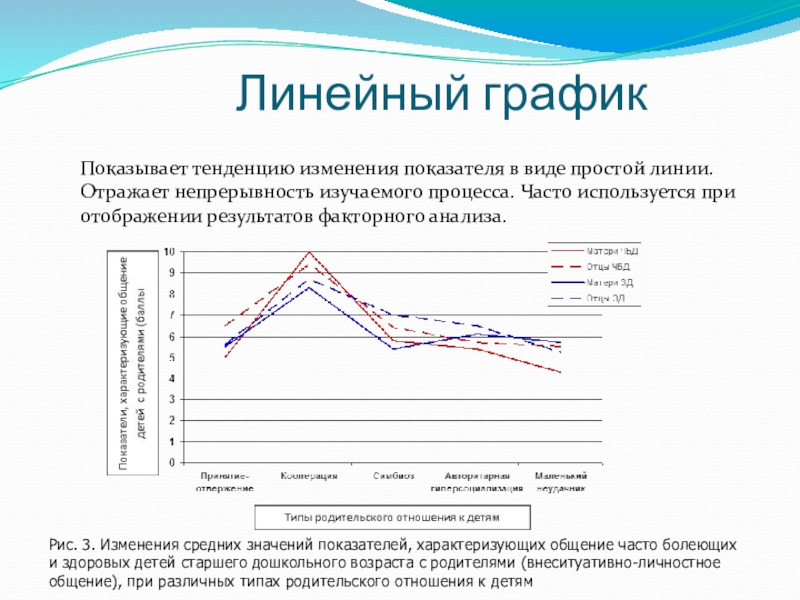 Рис. 3. Изменения средних значений показателей, характеризующих общение часто болеющих и здоровых детей старшего дошкольного возраста с родителями (внеситуативно-личностное общение), при различных типах родительского отношения к детям
