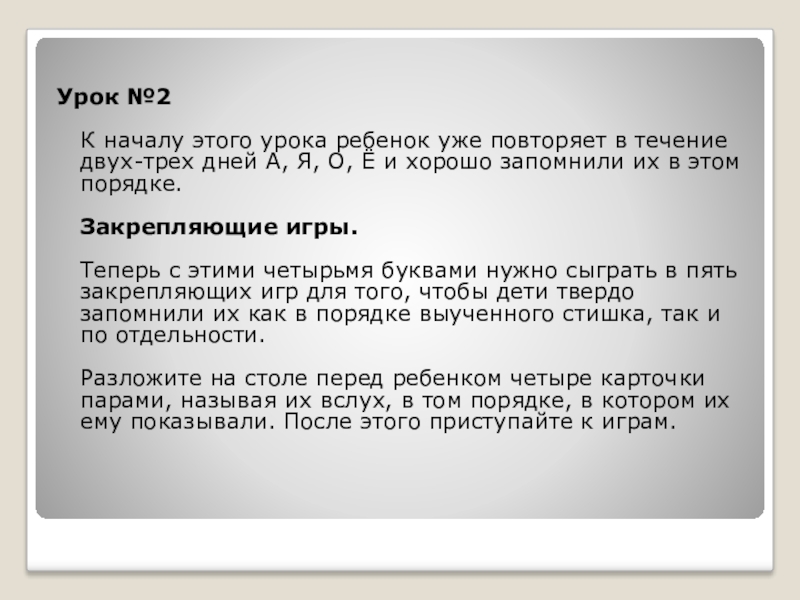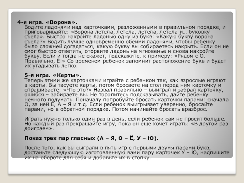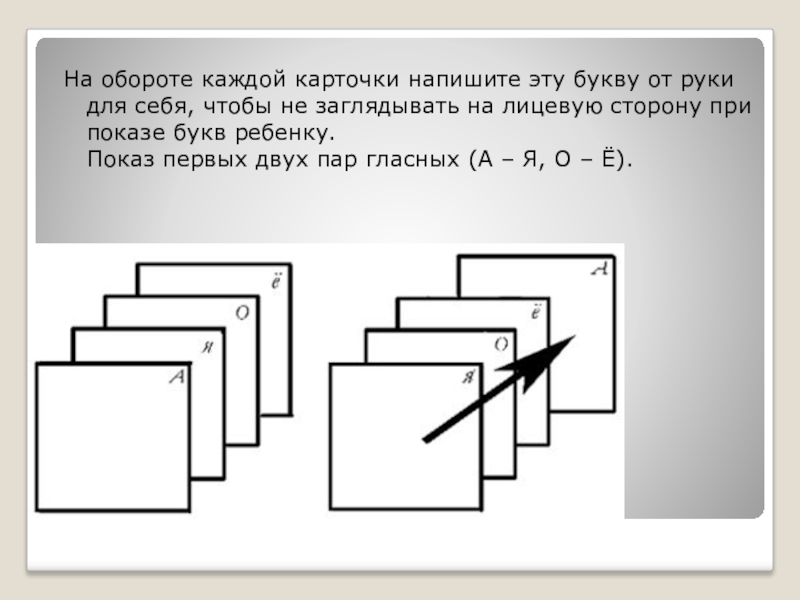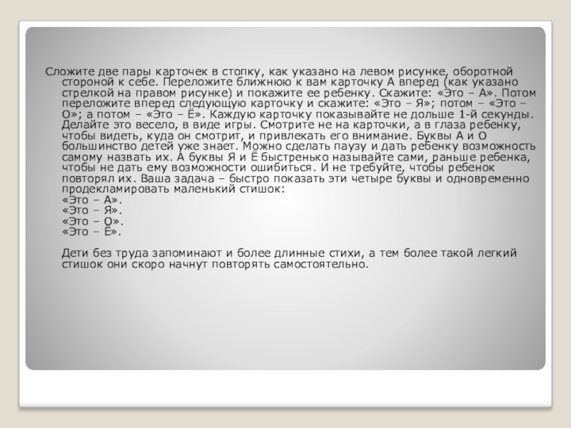оборотной стороной к себе. Переложите ближнюю к вам карточку А вперед (как указано стрелкой на правом рисунке) и покажите ее ребенку. Скажите: «Это – А». Потом переложите вперед следующую карточку и скажите: «Это – Я»; потом – «Это – О»; а потом – «Это – Ё». Каждую карточку показывайте не дольше 1-й секунды. Делайте это весело, в виде игры. Смотрите не на карточки, а в глаза ребенку, чтобы видеть, куда он смотрит, и привлекать его внимание. Буквы А и О большинство детей уже знает. Можно сделать паузу и дать ребенку возможность самому назвать их. А буквы Я и Ё быстренько называйте сами, раньше ребенка, чтобы не дать ему возможности ошибиться. И не требуйте, чтобы ребенок повторял их. Ваша задача – быстро показать эти четыре буквы и одновременно продекламировать маленький стишок: