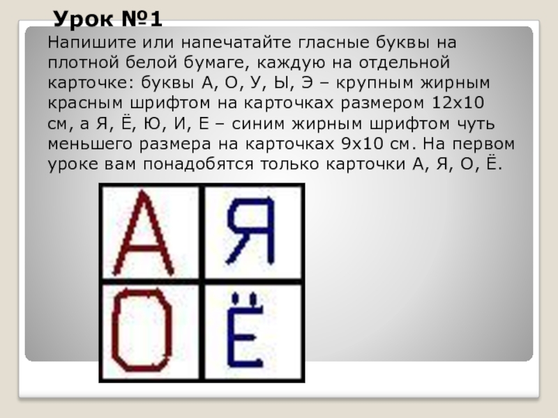 бумаге, каждую на отдельной карточке: буквы А, О, У, Ы, Э – крупным жирным красным шрифтом на карточках размером 12х10 см, а Я, Ё, Ю, И, Е – синим жирным шрифтом чуть меньшего размера на карточках 9х10 см. На первом уроке вам понадобятся только карточки А, Я, О, Ё.