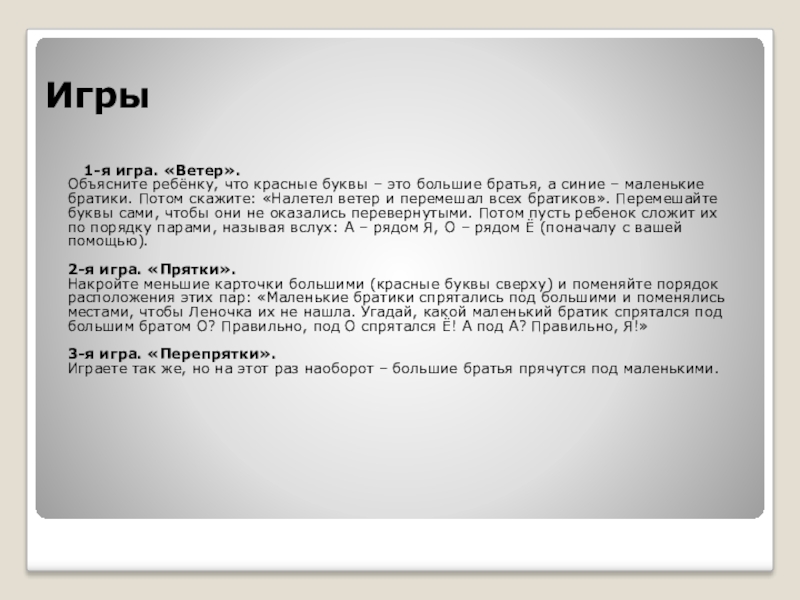 Теперь с этими четырьмя буквами нужно сыграть в пять закрепляющих игр для того, чтобы дети твердо запомнили их как в порядке выученного стишка, так и по отдельности.