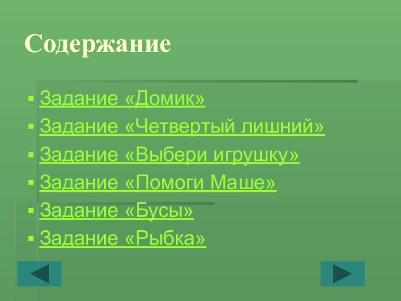 СодержаниеЗадание «Домик»Задание «Четвертый лишний»Задание «Выбери игрушку»Задание «Помоги Маше»Задание «Бусы»Задание «Рыбка»