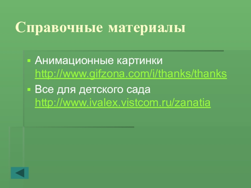 Справочные материалыАнимационные картинки http://www.gifzona.com/i/thanks/thanksВсе для детского сада http://www.ivalex.vistcom.ru/zanatia