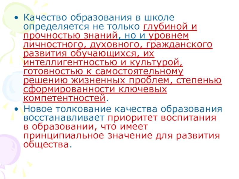 Новое толкование качества образования восстанавливает приоритет воспитания в образовании, что имеет принципиальное значение для развития общества.