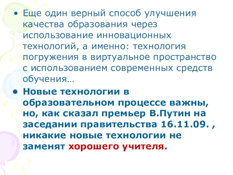 Новые технологии в образовательном процессе важны, но, как сказал премьер В.Путин на заседании правительства 16.11.09. , никакие новые технологии не заменят хорошего учителя.