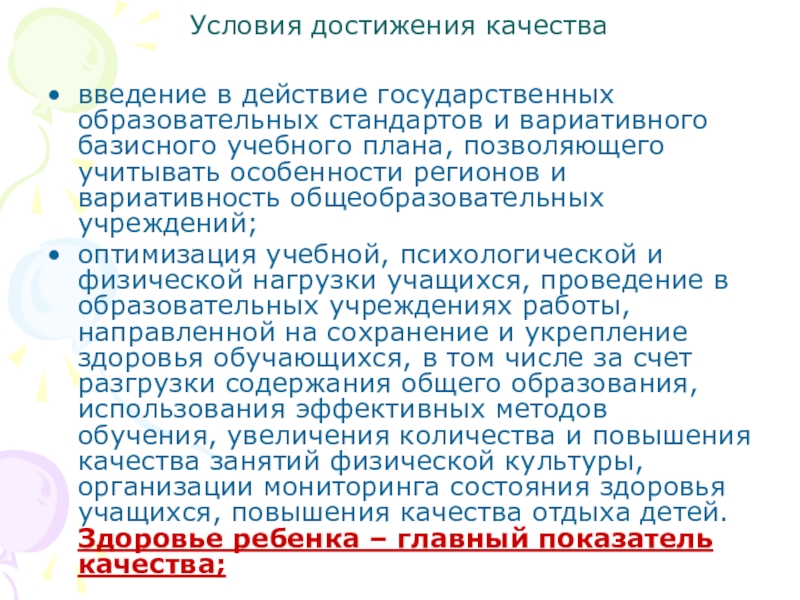оптимизация учебной, психологической и физической нагрузки учащихся, проведение в образовательных учреждениях работы, направленной на сохранение и укрепление здоровья обучающихся, в том числе за счет разгрузки содержания общего образования, использования эффективных методов обучения, увеличения количества и повышения качества занятий физической культуры, организации мониторинга состояния здоровья учащихся, повышения качества отдыха детей. Здоровье ребенка – главный показатель качества;
