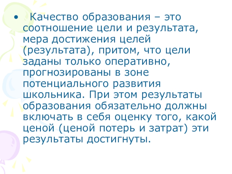 Слайд 3 Качество образования – это соотношение цели и результата, мера достижения