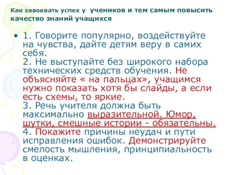 Слайд 11Как завоевать успех у учеников и тем самым повысить качество знаний