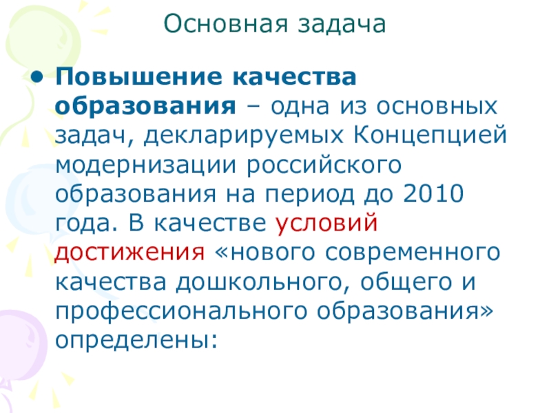 модернизации российского образования на период до 2010 года. В качестве условий достижения «нового современного качества дошкольного, общего и профессионального образования» определены: