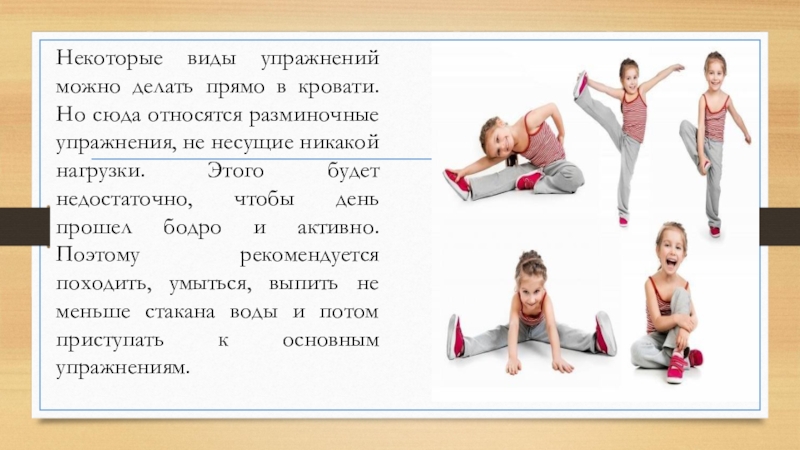 Слайд 8Некоторые виды упражнений можно делать прямо в кровати. Но сюда относятся