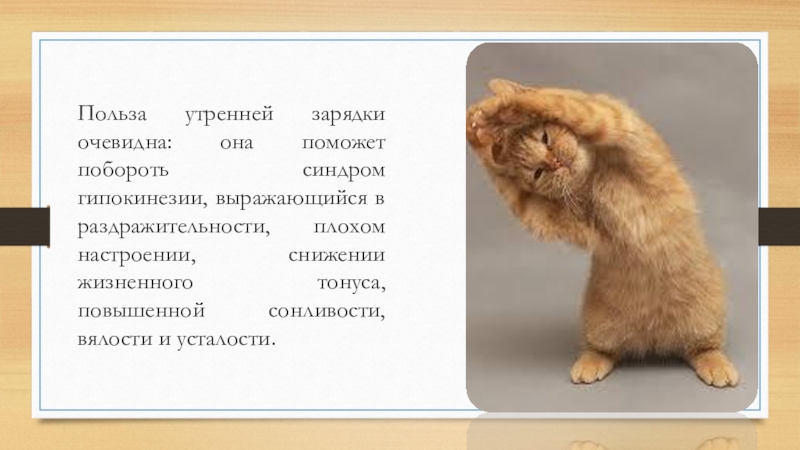 Слайд 4Польза утренней зарядки очевидна: она поможет побороть синдром гипокинезии, выражающийся в