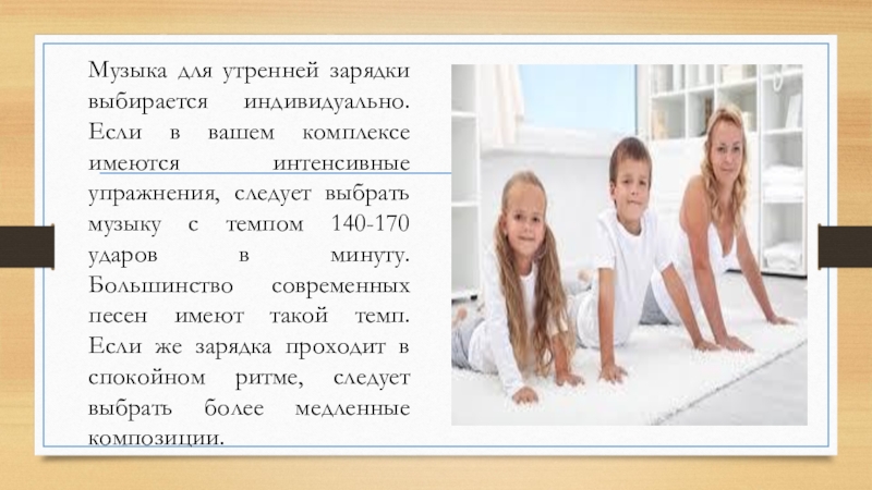 Слайд 9Музыка для утренней зарядки выбирается индивидуально. Если в вашем комплексе имеются