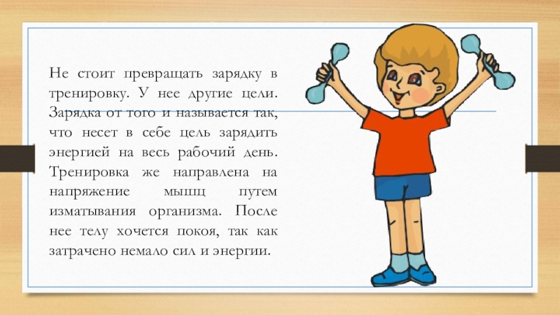 Слайд 5Не стоит превращать зарядку в тренировку. У нее другие цели. Зарядка