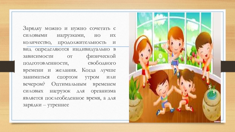 Слайд 7Зарядку можно и нужно сочетать с силовыми нагрузками, но их количество,