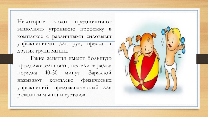 Слайд 6Некоторые люди предпочитают выполнять утреннюю пробежку в комплексе с различными силовыми